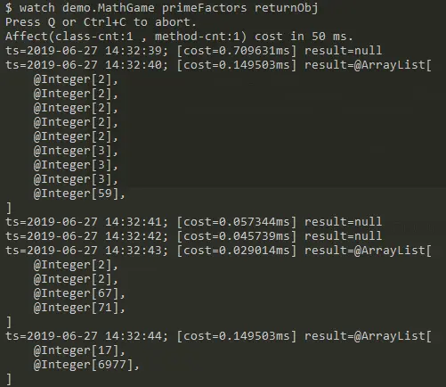 六、通过watch命令来查看demo.MathGame#primeFactors函数的返回值