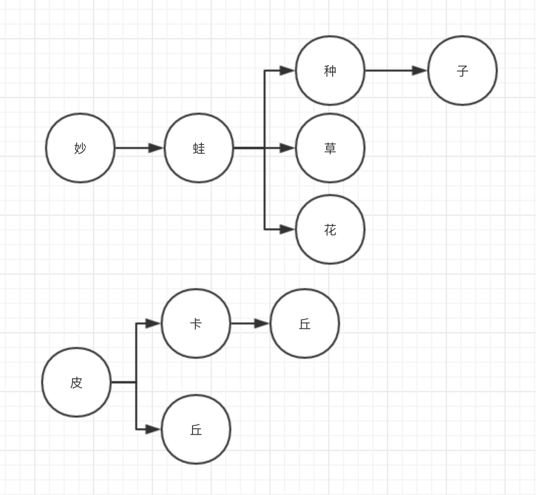 现在有几个关键词:妙蛙种子,妙蛙草,妙蛙花,皮卡丘,皮丘。我们现在对这些关键词进行一些操作,构造出一个有穷自动机出来。