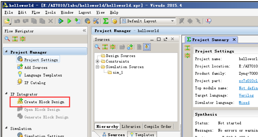 (1)ZYNQ 的PS开发一般有原理框图的形式来设计,这样硬件的连接看起来会更加直观。点击 Create Block Design 按钮来添加原理图设计文件。