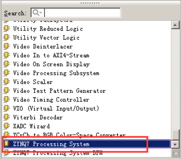 返里有很多 Xilinx 提供的 IP,我们找到 ZYNQ7 Processing System 双击添加,不要选择后面带 BFM(总线功能模型),带 BFM 的 IP 为早期IP 处理器版本。