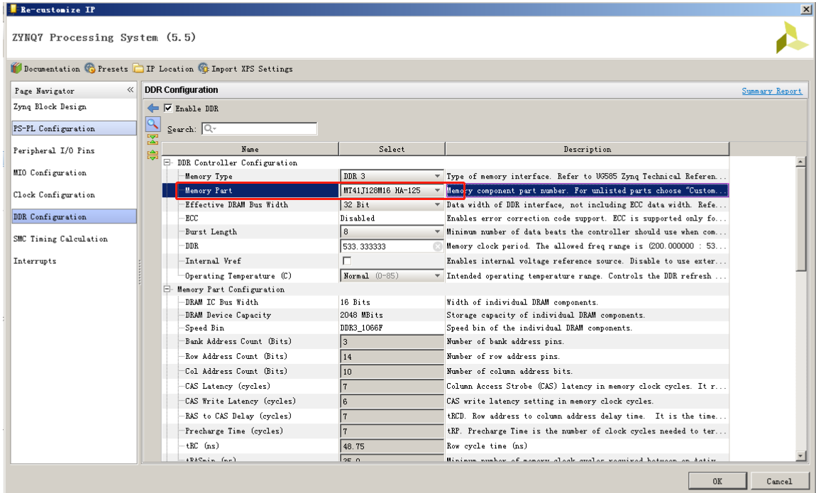 (7) 再打开 DDR Configration,在这个界面上是选择 DDR 芯片的名称和一些参数。我们再 Memory Part 中需要选择跟开发板上 DDR3 型号一样的名称(MT41J256M16 RE-125)。