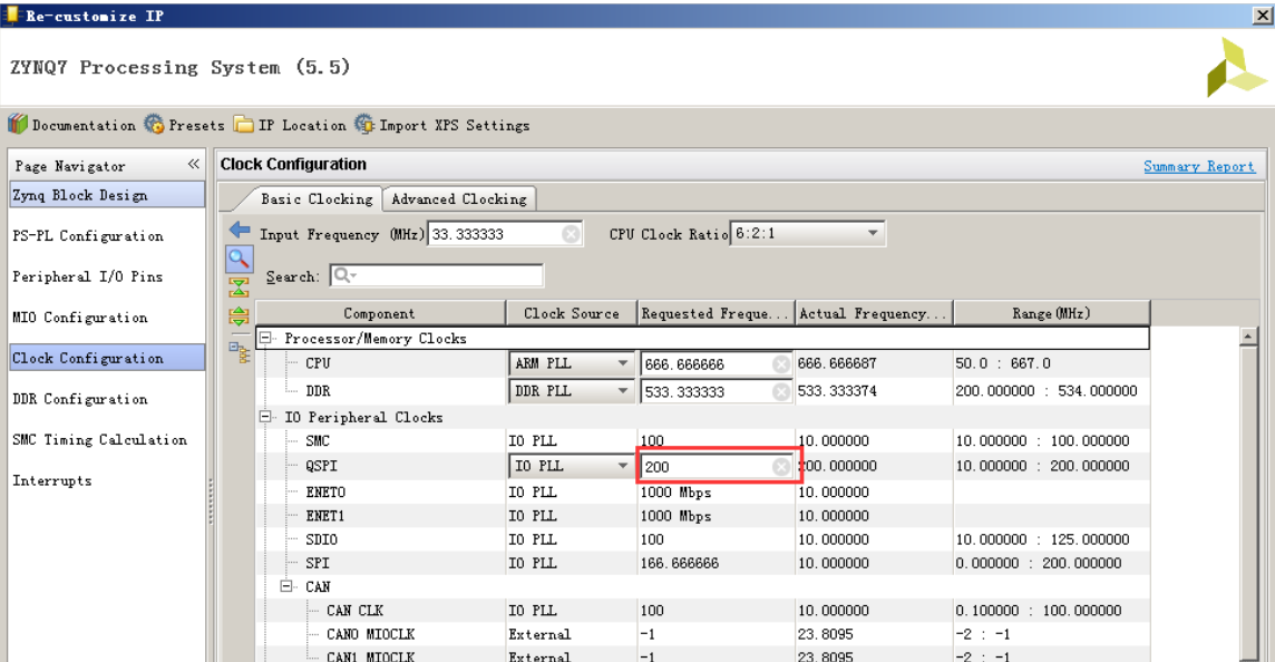 (9)在 Clock Configuration中,我们可以修改 QSPI 癿时钟频率,默认是 200Mhz。这里不做修改。