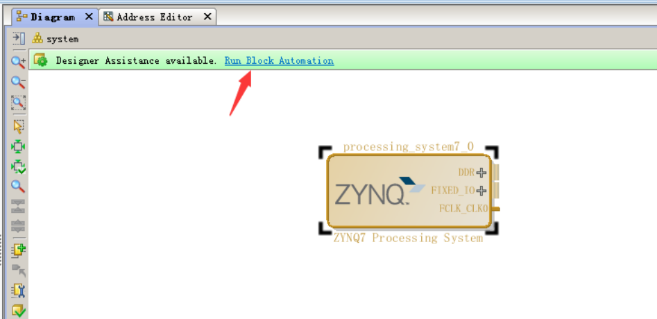 (10)在 Diagram 界面里点击"Run Block Automation"完成对 ZYNQ7 Processing System IP核的配置,生成外部 ZYNQ 系统的外部链接 IO 管脚。