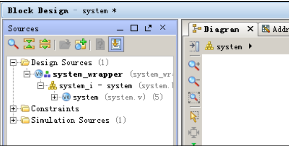 (11)在 Source 窗口中选中 system.bd,右键并先后选择Generate Output Projects 和 Create HDL Wrapper 选顷迕行操作。生成后如下图所示: