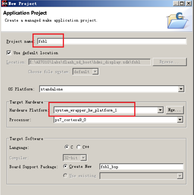 (17)仅在 Project name: 输入 fsbl,Hardware Platform 需要选择system_wrapper_hw_platform_0。