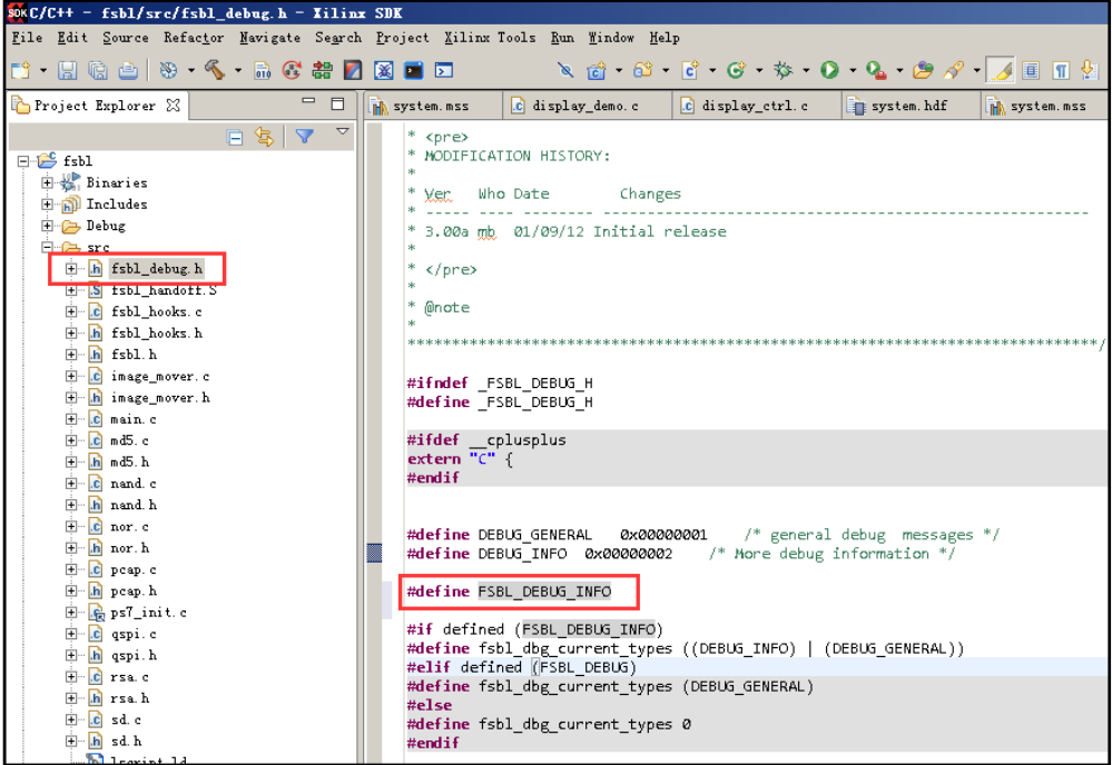 (19)为了能够让串口打印出 Bootloader 癿信息,我们返里需要在 fsbl_debug.h 文件里添加一条语句,定义一下“FSBL_DEBUG_INFO”常量。修改后保存,重新编译一下 fsbl 项目。