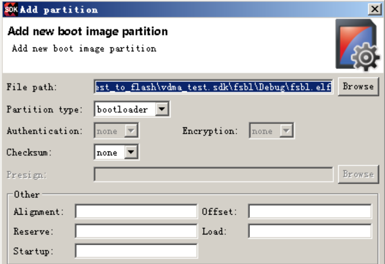 (21)点击 Add按钮, 在弹出的Add new boot image partition 对话框中, 点击 Browse 选择我们刚生成的 FSBL 可执行文件 fsbl.elf。返里 Partition type 为 bootloader,fsbl.elf 作为bootloader 程序。