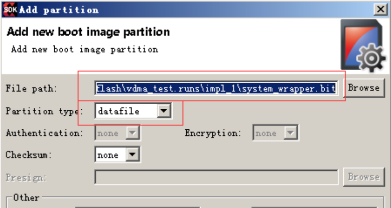 (22)点击 Add 按钮,在弹出的 Add new boot image partition 对话框中, 点击 Browse 按钮找到 FPGA PL的比特流文件 system_wrapper.bit, 这里 Partition type 为 datafile。