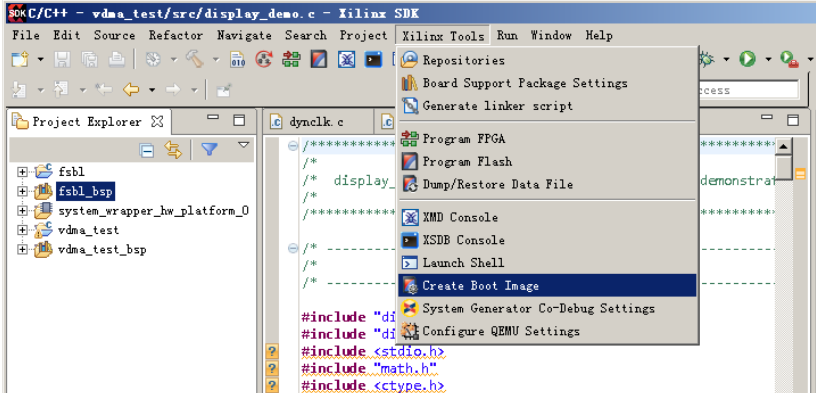 选择菜单 Xilinx Tools->Create Boot Image:
