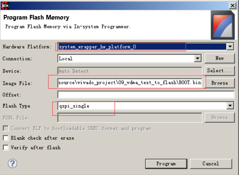 (3)在 Program Flash Memory 里, Hardware Platform 中选择 system_wrapper_hw_platform_0, 烧写癿 Image File 选择刚生成的 BOOT.bin 文件,Flash Type 选择 qspi_single。