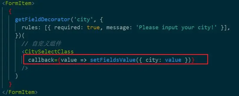 思路:Antd的Form有个设置Form.Item值的方法:props.form.setFieldsValue({ key: value }),我们可以通过给自定义组件传入一个callback函数——> 在自定义组件中将值传给callback——> 通过callback设置Form.Item的值。