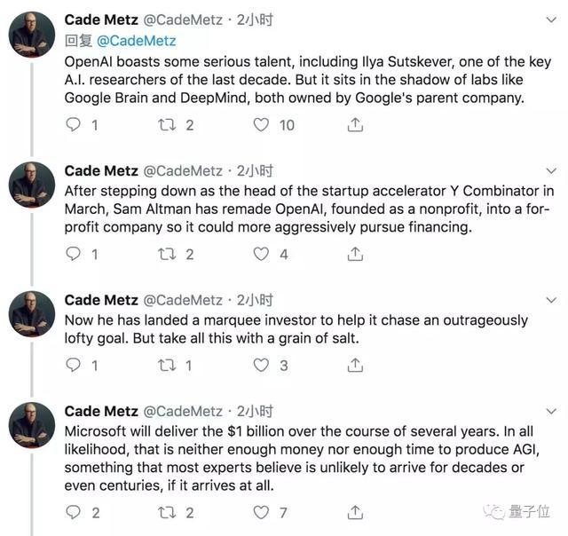而这篇文章的作者,《纽约时报》记者Cade Metz则在自己的Twitter上评价说,虽然OpenAI坐拥不少重量级人才,但它一直处在Google Brain和DeepMind这些谷歌系天团的阴影之下。