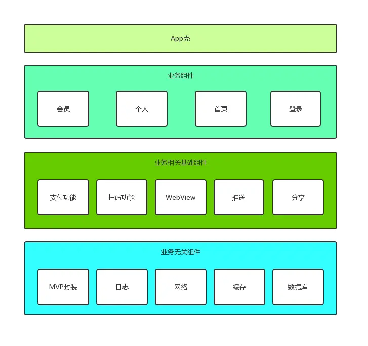 我们将项目自上而下分为四层:壳工程、业务组件层、业务相关基础组件层、业务无关组件层。这四层分别承担的责任如下: