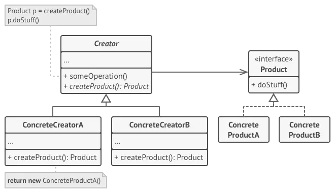 - 工厂方法的子类是生产不同的产品(ProductA,ProductB),这些产品是有共同父类的(Product)