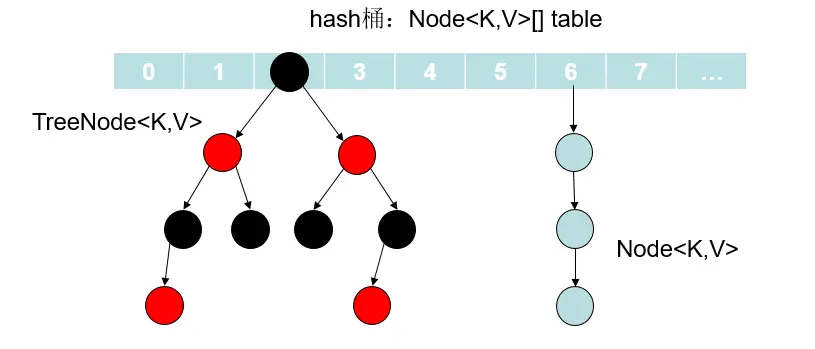 因为主要说的是1.8版本中的实现。而1.8中HashMap是数组+链表+红黑树实现的,大概如下图所示。后面还是主要介绍Hash Map中主要的一些成员以及方法原理。