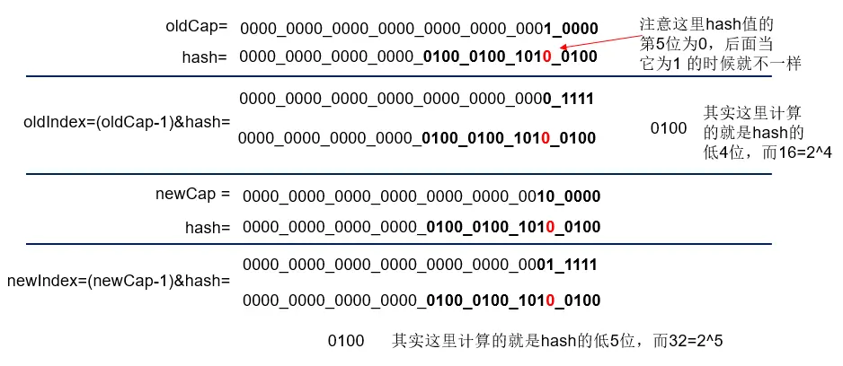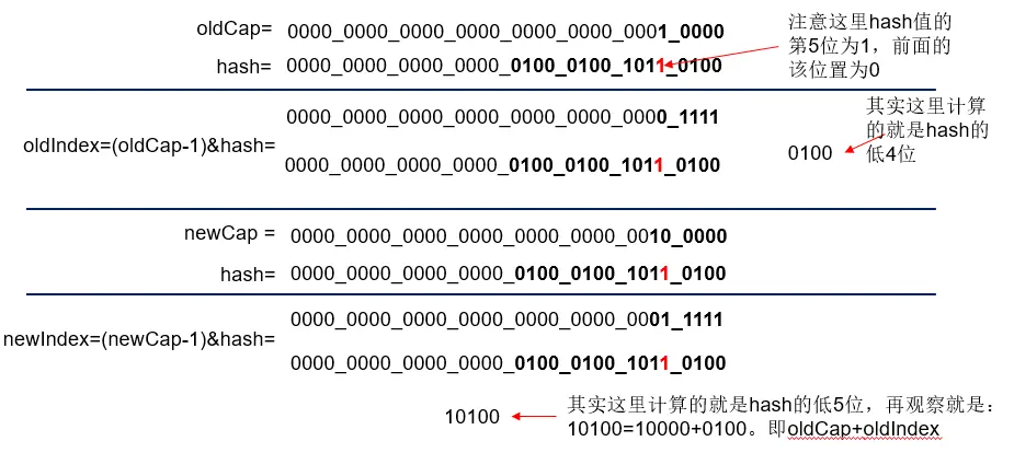 (2)若判断条件为假,则 oldCap为1的那位对应的hash位为1。比如新下标=hash&( newCap-1 )= hash&( (16<<2) - 1)=10010,相当于多了10000,即 oldCap .如同下面的例子