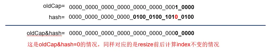 从上面计算发现,当cap为1的那位对应的hash为0的时候,resize前后的index是不变的。我们再看下面,使用上面的hash值,对应的就是 (e.hash & oldCap) == 0,恰好也是下标不变的