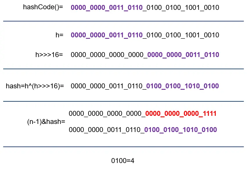 假设现在我们向一个map中添加元素,例如map.put("fsmly","test"),那么其中key为"fsmly"的hashCode的二进制表示为0000_0000_0011_0110_0100_0100_1001_0010,按照上面的步骤来计算,那么我们调用hash算法得到的hash值为: