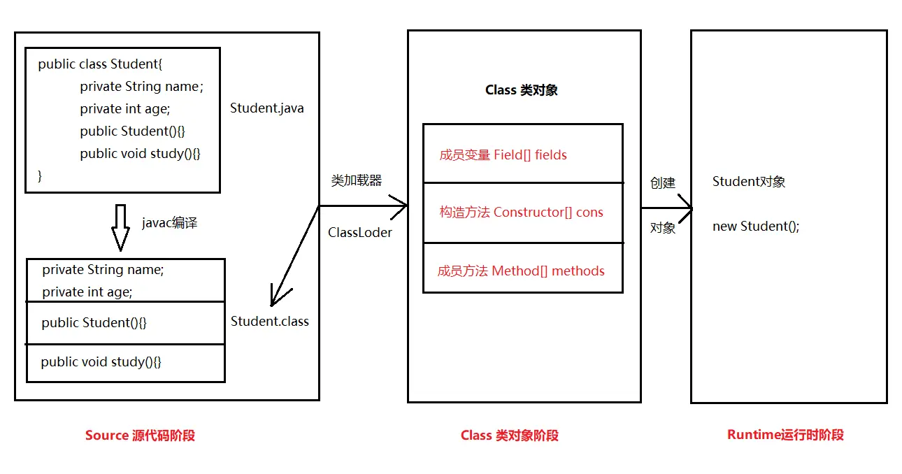我们从最初的 javac -HelloWorld.java,到面向对象部分,我们可以将Java代码在计算机中经历的阶段分为三部分:Scource源代码阶段 —— Class类对象阶段 —— Runtime运行时阶段 而我们知道,Java中一个类在源代码阶段,是存储在硬盘中的,而编译后,就已经被加载到内存中区,那么有没有一种方法可以在这种情况下,获取或者修改它的方法或者属性呢?这就是我们今天所讲的Java反射机制