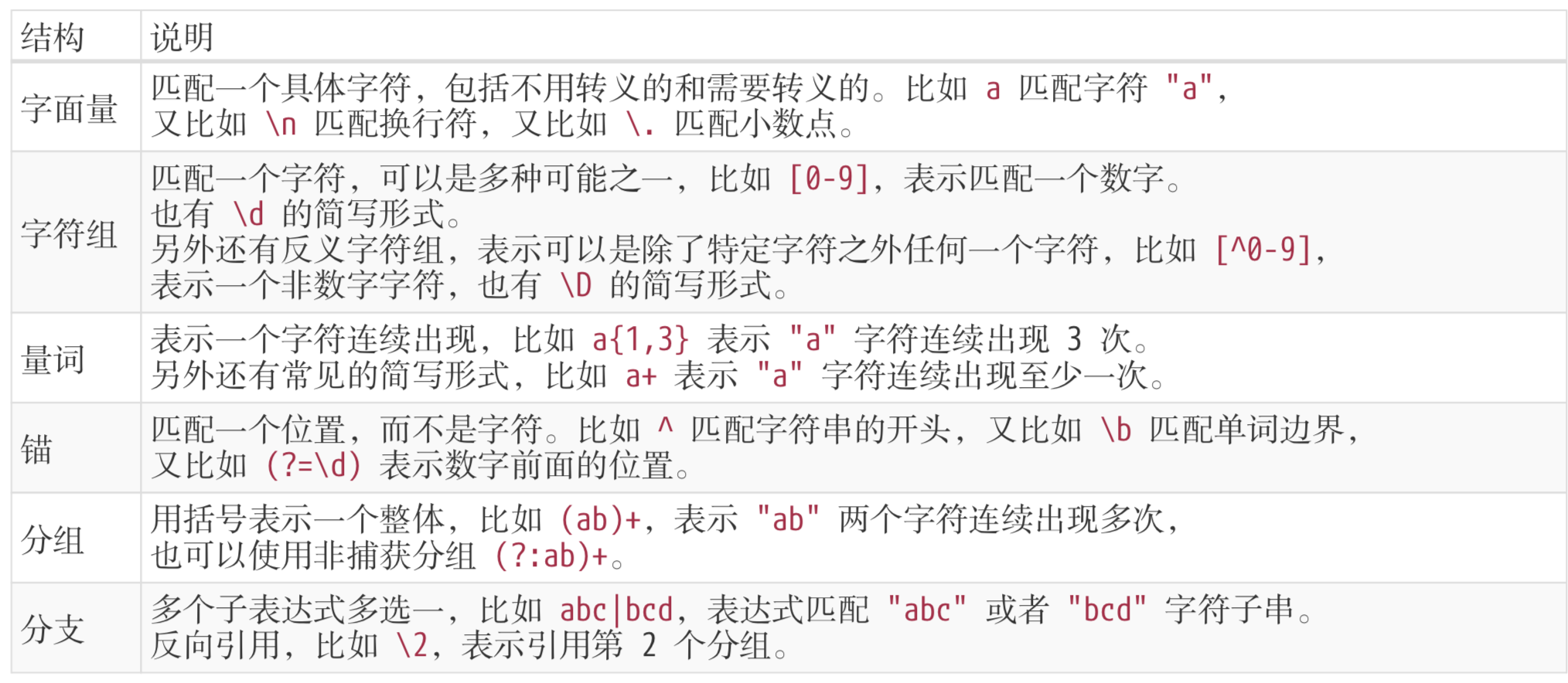 即一个正则表达式,都是由字面量,字符组,量词,位置,分组,分支等结构组成。