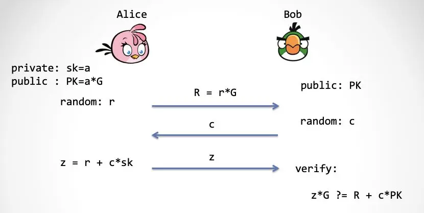首先 Alice 产生一对「公私钥」,(PK, sk)。然后 Bob 持有 Alice 的公钥 PK。当 Alice 要向 Bob 证明身份时,他们会通过一个「三步交互协议」来完成证明:证明 Alice 拥有私钥 sk。如果 Bob 接受了这个证明,那么 Bob 会认为 对面证明有私钥的人就是 Alice。下面简单描述下这个协议: