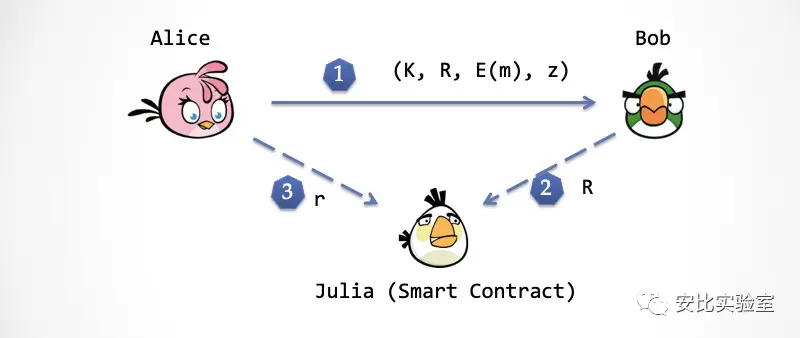 最后,Julia 有没有可能作弊呢?Julia 是智能合约,她的任何行为和内部状态都能被任何人读取,那么通过 Julia 是有可能产生信息泄露的,从而对 Alice 或者 Bob 不利。但是请大家注意下,Julia 其实并不接触任何和数据明文 m 相关的信息,也就从链上不会泄露 m 的信息。Julia 接触到的信息只有两个,R 和 r。