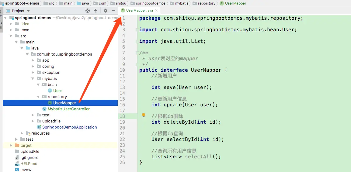 <mapper namespace="com.shitou.springbootdemos.mybatis.repository.UserMapper">