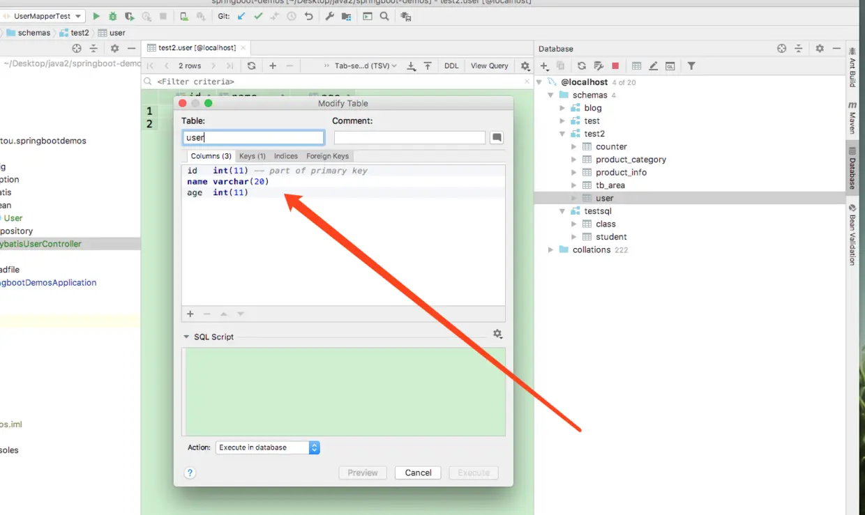 我们这里就简单的创建一个user类,和我们的user表对应,只有id,name,age三个字段