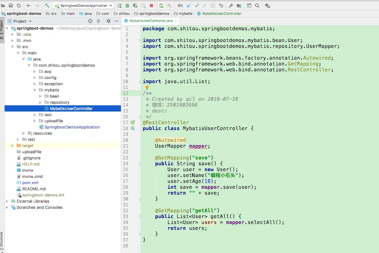这时候mybatis的配置还不算成功,我们需要把mapper的路径暴露给spring 让它来扫描管理,所以我们需要在Chapter4Application.java文件上加上注解@MapperScan("com.shitou.springbootdemos.mybatis.repository") 扫描mapper的所在位置
