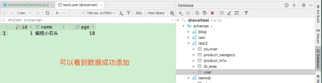 如上图所示,我们定义一个controller来实现一个增加数据的接口。和一个查询所有用户的接口。 1, 启动项目。