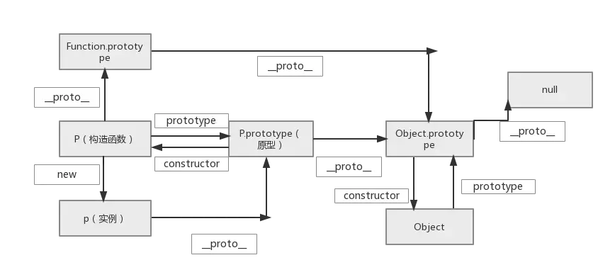 原型链就是按照 proto 寻找,直到 Object。instanceof 原理也是根据原型链判断的; p.proto==P.prototype=>P.prototype.proto==object.prototype=>object.prototype.proto==null