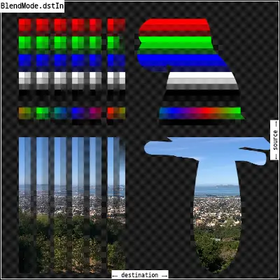 /// Show the destination image, but only where the two images overlap. The /// source image is not rendered, it is treated merely as a mask. The color /// channels of the source are ignored, only the opacity has an effect. /// To show the source image instead, consider [srcIn]. // To reverse the semantic of the mask (only showing the source where the /// destination is present, rather than where it is absent), consider [dstOut]. /// This corresponds to the "Destination in Source" Porter-Duff operator.