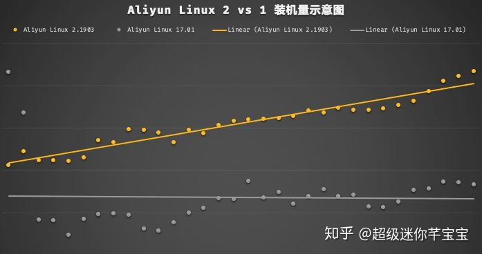 图:Alibaba Cloud Linux 2 (官网产品名:Aliyun Linux 2) 在 阿里云 ECS 上过去一个月 vcpu 保有量增长示意图 (仅展示趋势,不代表绝对数值)