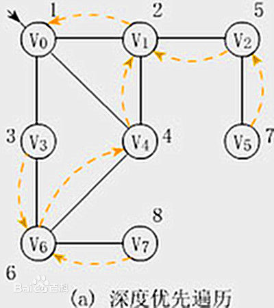 图的深度优先遍历类似于树的前序遍历。采用的搜索方法的特点是尽可能先对纵深方向进行搜索。这种搜索方法称为深度优先搜索(Depth-First Search)。相应地,用此方法遍历图就很自然地称之为图的深度优先遍历。