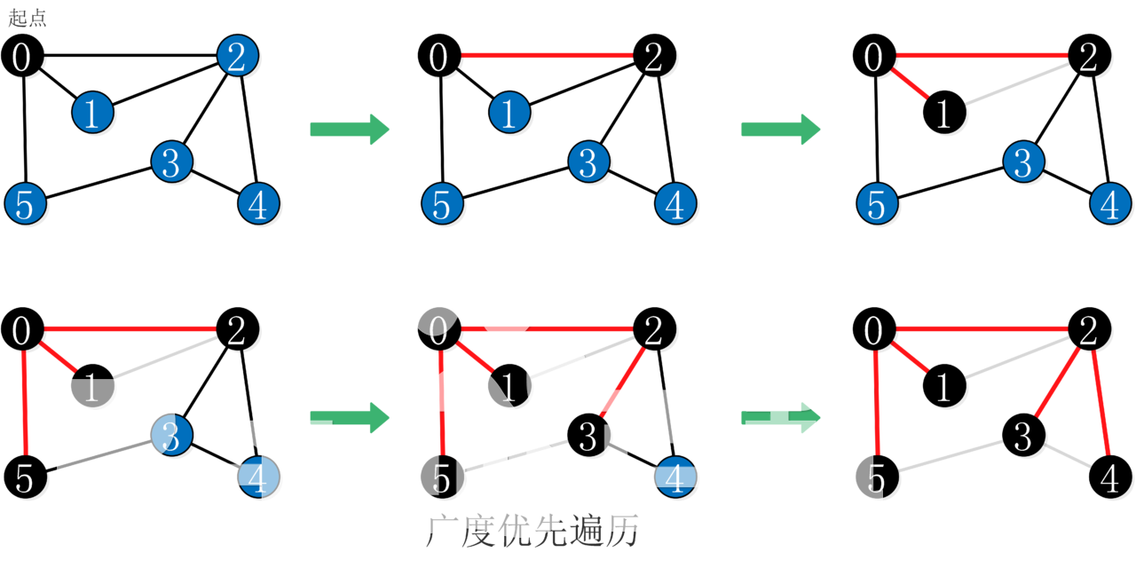 - 重复步骤2,直到全部顶点都被访问为止。