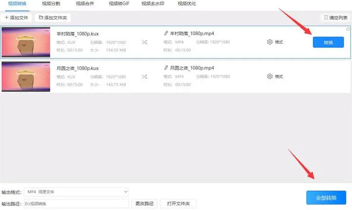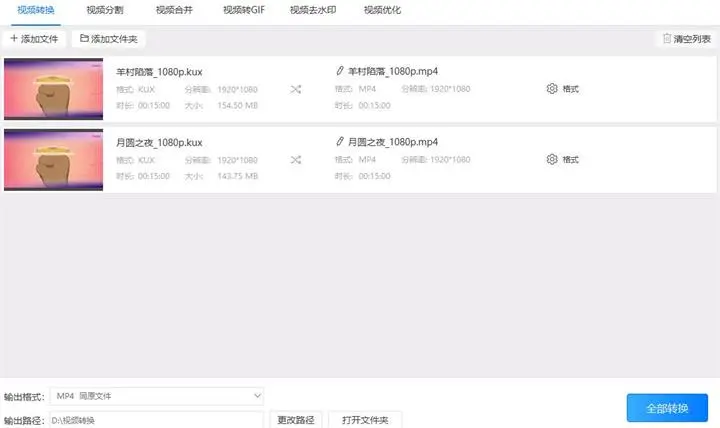 5、以上各项参数都调整好后可以依次点击“转换”按钮或直接点击“全部转换”按钮统一把优酷的kux格式转换成mp4。转换时会出现一个进度条,进度条到100%就表示视频已经转换好了。最后只需打开之前设置好的输出路径就可以找到转换后的文件了。