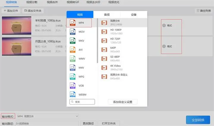 2、把kux格式的视频添加到软件后对“输出格式”进行设置。设置时可以点击“格式”按钮依次设置也可以点击“输出格式”按钮统一输出的格式。因为要把优酷的kux格式转换成mp4所以把输出的视频格式设置为‘mp4’格式。