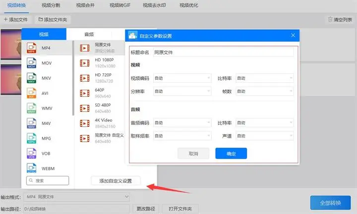 3、如果软件预设的参数满足不了需求可以点击“添加自定义设置”按钮根据需求设置输出视频的视频编码、比特率、分辨率、帧数和输出音频的音频编码、比特率、取样频率、声道的参数以满足需求。如果预设的参数够用可以忽略这个步骤。
