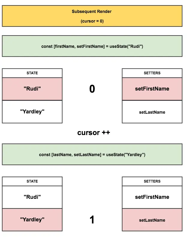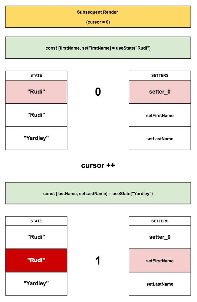 每次后续渲染都会重置光标,并且只从每个数组中读取这些值。