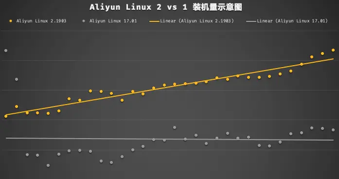 图:Alibaba Cloud Linux 2 (官网产品名:Aliyun Linux 2) 在 阿里云 ECS 上过去一个月 vcpu 保有量增长示意图 (仅展示趋势,不代表绝对数值)