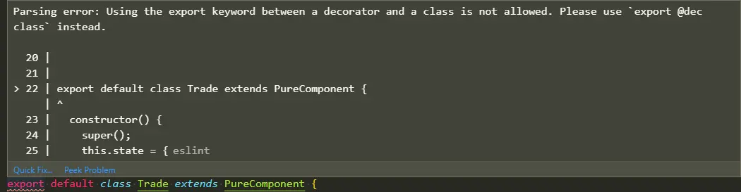 // 修改方案 @Form.create() // 这个就是那个装饰器 class Trade extends PureComponent { ... } export default Trade -