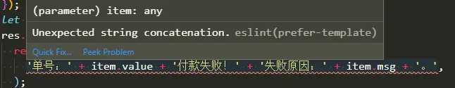 ``,使代码更加直观// 修改方案 values.remark ? `:${values.remark}` : '' const msg = []; res.body.map(item => { return msg.push( `单号:${item.value}付款失败!失败原因:${item.msg}。`, ); }); -