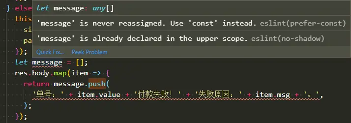push操作不算改变变量,使用const来定义变量由于使用了 antd 的 message 组件,所以如图所示,提示上层作用域已经存在