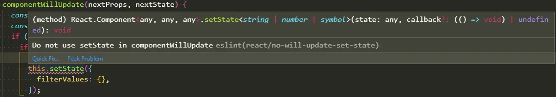 componentWillUpdate中使用setState 原因:当组件收到新的props或state时,会在渲染之前调用此方法。如果在此方法中使用setState则会触发另一个componentWillUpdate,引起无限循环。