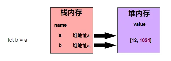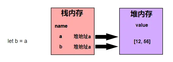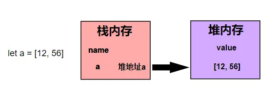 当我们定义a的时候,在栈内存中开辟一个内存空间存储变量名a,栈内提供引用地址指向堆内存中的值[12, 56],如下图所示: