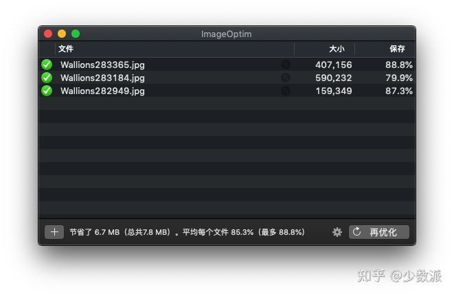 实测下来,即使是完全「无损」的压缩,ImageOptim 通常也能让图片的体积减小 1/3 以上。如果开启 ImageOptim「轻量的有损压缩」,那么直接减小 80% 的体积也是非常常见的。由于 ImageOptim 所有运算工作全部在本地进行,因此运行效率也是非常快速的。对 PNG、JPG、GIF 等格式的图片文件,ImageOptim 压缩得都游刃有余。