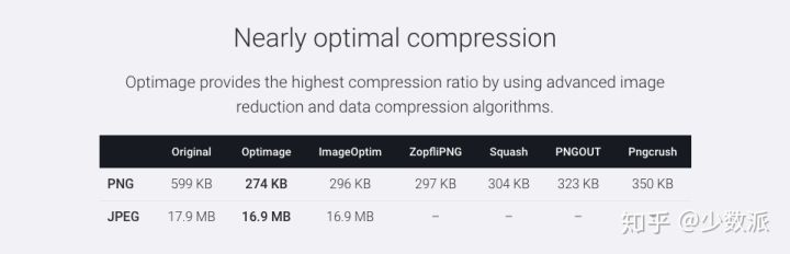 在 Optimage 的官方网站上面,Optimage 还对其压缩比例、压缩性能等指标进行了展示。由于 Optimage 使用的是自研的压缩算法,所以 Optimage 在数据方面确实比其他图像压缩软件要好上一些,但是我自己使用过程中,Optimage 对相对较大的 PNG 图片进行处理的时间要长很多很多。
