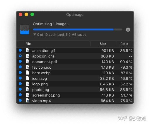 除了 ImageOptim,另一个功能相对丰富一些的图片压缩软件叫做 Optimage。同样是图片压缩,Optimage 除了能够压缩 PNG、JPG 和 GIF 动图外,还可以有效减少 PDF 文稿、MP4 视频以及 SVG 矢量图等等格式的文件体积。对于一些比如 macOS 专用的 icns 图标文件、Windows 以及 Web 用的 ico 图标文件以及专为网页设计使用的 webp 格式的图片文件,Optimage 统统都能压缩。