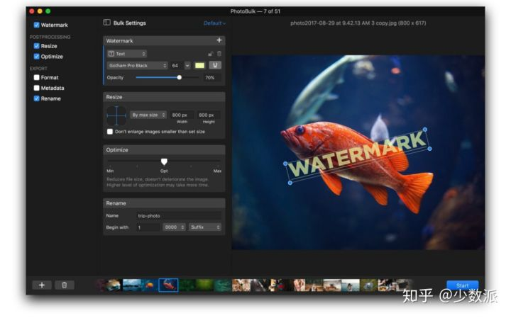 Photobulk 是一个非常适合用于给图片「添加文字效果」的应用,软件的基础功能就是为图片在固定位置添加自己设计的「水印」。Photobulk 的操作逻辑清晰,我们可以直接设置使用 macOS 原生的多种字体,为水印设置颜色、添加特效等等。