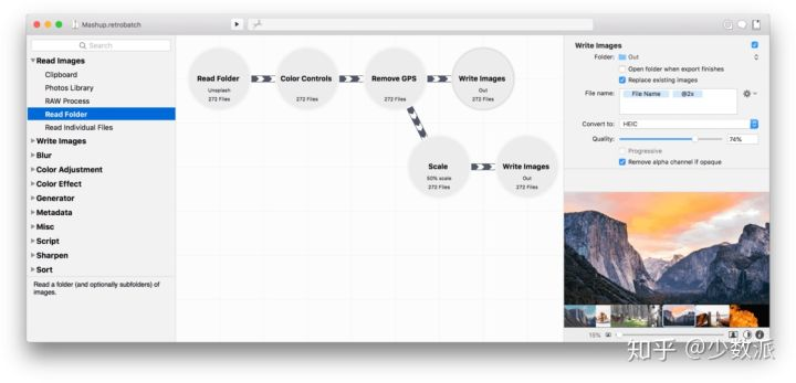 说到「工作流」,就不得不提起 Retrobach 这一应用。强大的 Retrobatch 利用高度集成的图形化界面,能够让我们为自己的图片工作进行「流程上面的定制」。Retrobatch 支持有: